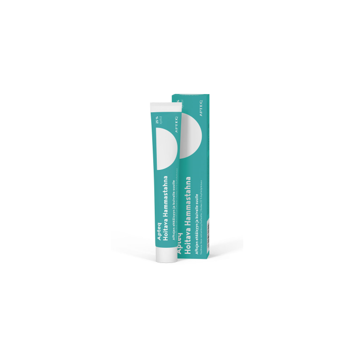 Skonsam och frisk tandkräm, speciellt utveklad för personer med torr och känslig mun. Mycket hög 25 % xylitolhalt. Användningsändamål: Apteq Plus Tandkräm utväcklades i samband med munvårdsspecialister för att speciellt passa personer med torr och känslig mun. Tandkrämen har en hög 25 % xylitolhalt och skummar skonsamt utan att innehålla tvättmedel som irriterar slemhinnor, såsom natriumlaurylsulfat. Hög xylitolhalt förebyggar Streptococcus mutans -bakterier som orsakar karies, ökar salivproduktion och motverkar nedgång av pH i saliv. Tandkrämen innehåller betain och olivbladsextrakt som återfuktar och vårdar slemhinnor. Skummar skonsamt utan slemhinnor irriterande natriumlaurylsulfat. Fluorhalt 1450 ppm. Dosering: Borsta tänder med Apteq Plus Tandkräm för 2 minuter varje morgon och kväll. Sexåriga och yngre barn: använd en ärtstor klick tandkräm vid tandborstningen. Tandborstning bör hjälpas och kontrolleras för att minimera sväljad tandkräm. Kontakta tandläkaren eller läkaren vid