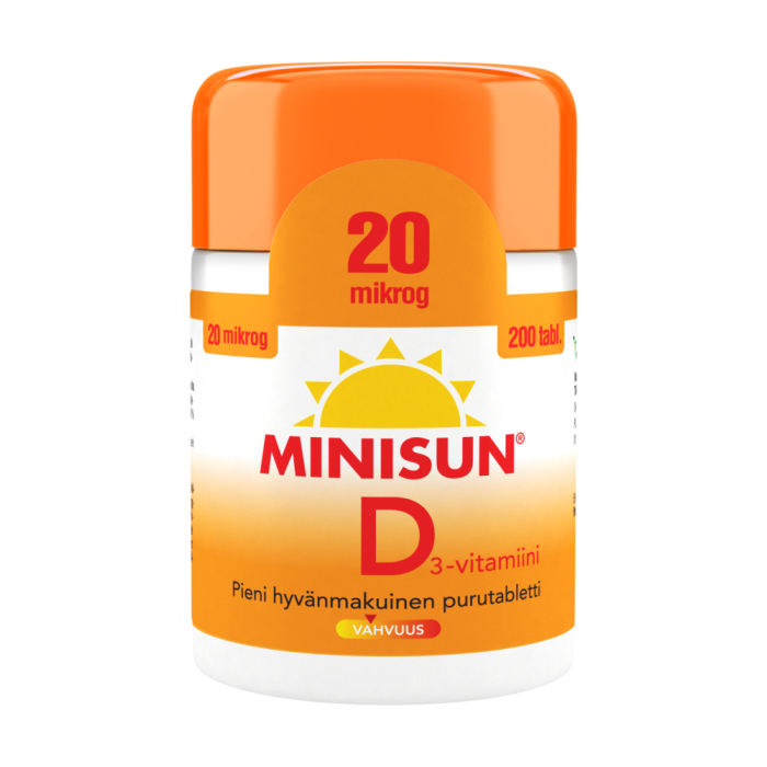 Minisun D-vitaminserien som utvecklats i Finland är ett enkelt sätt att trygga behovet av vitamin D året om. Minisun 20 mikrog innehåller vitamin D3 som effektivt tas upp i kroppen. Vitamin D förstärker motståndskraften och är ett viktigt vitamin för välmående benstomme, muskler och tänder. Doseringen är enkel - en liten tuggtablett per dag räcker till. Minisun 20 mikrogram lämpar sig för unga och vuxna för ett effektiverat dagligt intag året om. Tabletterna är sötade med xylitol, och de kan tas både som sug- och tuggtabletter, sväljas hela eller krossas. Produkten innehåller varken laktos, gluten, jäst, soja eller gelatin. Dosering: 1 tablett dagligen. Tabletten kan tuggas, sugas eller sväljas. Innehåll: En tablett innehåller: D3-vitamin (kolekalciferol) 20 mikrog (800 IU), 400 % av referensvärdet. Förteckning över ingredienser: Sötningsmedel (sorbitol, xylitol), klumpförebyggande medel (magnesiumsalter av fettsyror), D3-vitamin (kolekalciferol). Innehåller sötningsmedel. Överdriv