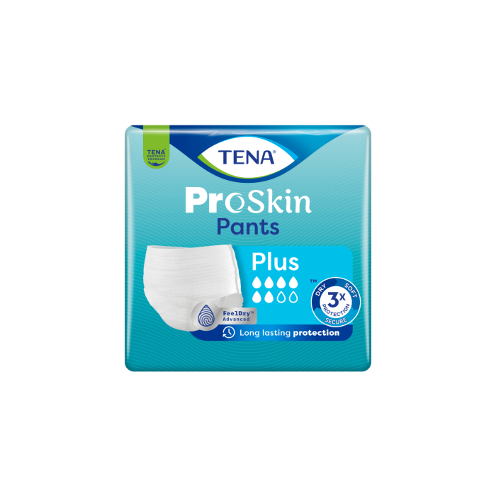 TENA ProSkin Pants Plus skyddande underbyxor skyddar upp till 100 % mot måttlig till svår urinläckage. De absorberar snabbt vätska och håller huden torr länge, dag som natt. Pålitliga engångsunderbyxor för en aktiv vardag, för både kvinnor och män. Tack vare FeelDry Advanced™-teknologin absorberas vätskan på ytan inom sekunder och låses in i lagren, vilket håller huden torrare och bättre skyddad. Den absorberande kärnan neutraliserar lukt omedelbart, vilket gör skyddet diskret och ger dig ökad självsäkerhet. Mjuka och bekväma TENA ProSkin Pants håller huden torr och skyddar pålitligt mot läckage – så att du kan leva ditt aktiva liv som du vill. -Långvarigt skydd -FeelDry Advanced™ -Huden hålls skyddad